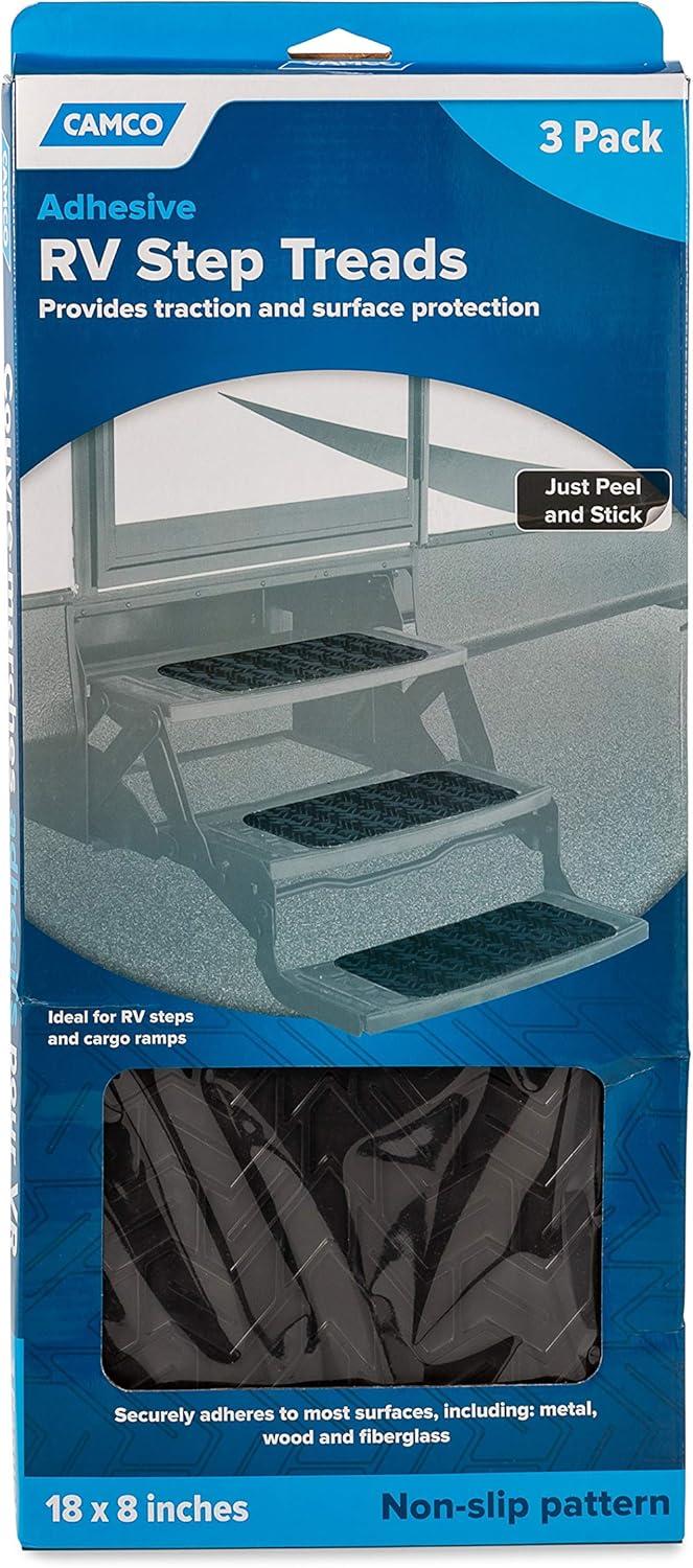 Camco's RV Step Treads are ideal for RV steps and cargo ramps, providing both traction and surface protection. They feature an adhesive that securely adheres to most surfaces, including: metal, wood, fiberglass and TPO. Each tread measures 18-inches x 8-inches. They are easy to install—simply peel and stick. Weatherproof treads simply clean with soap and water. Quantity: 3 treads per pack.
