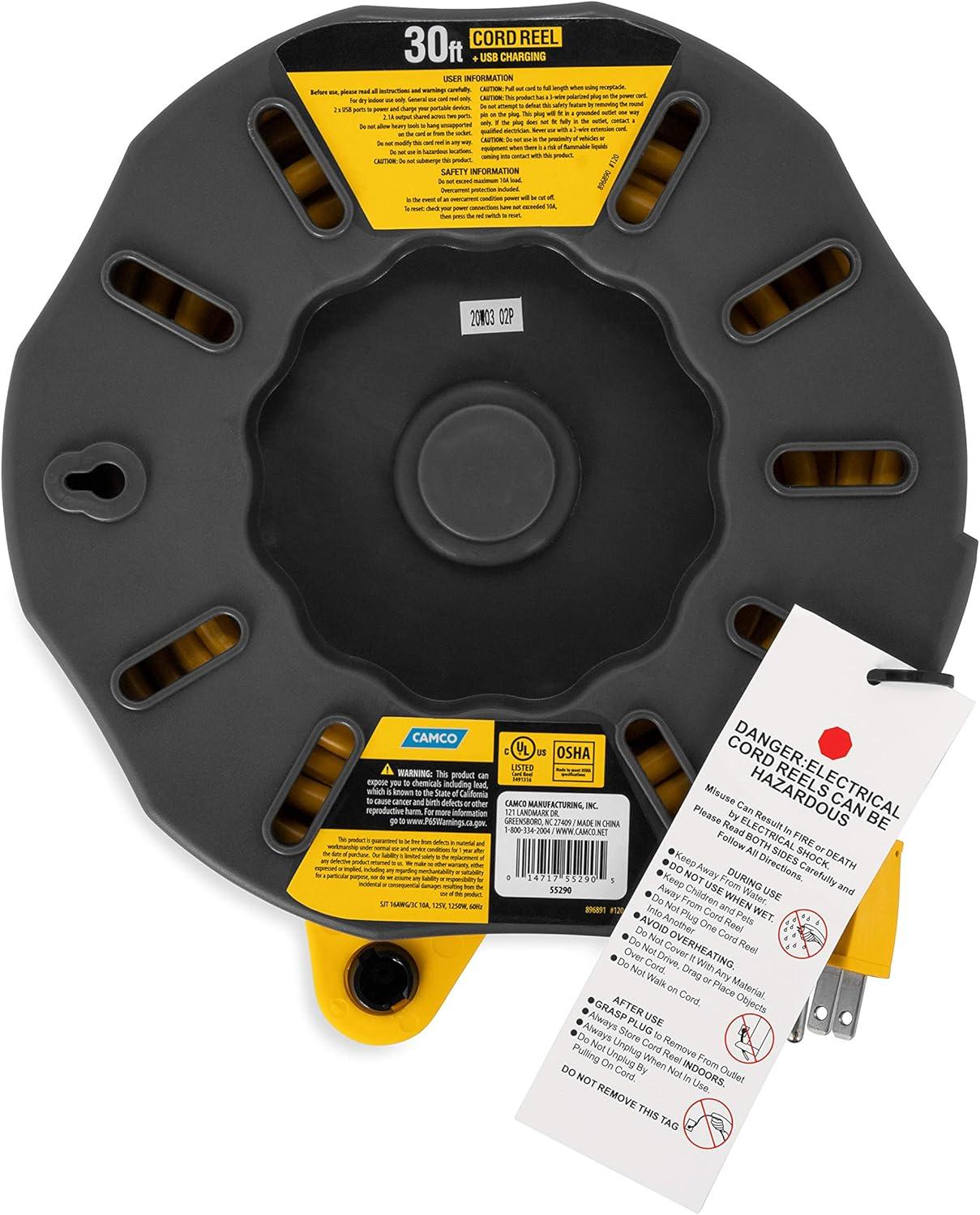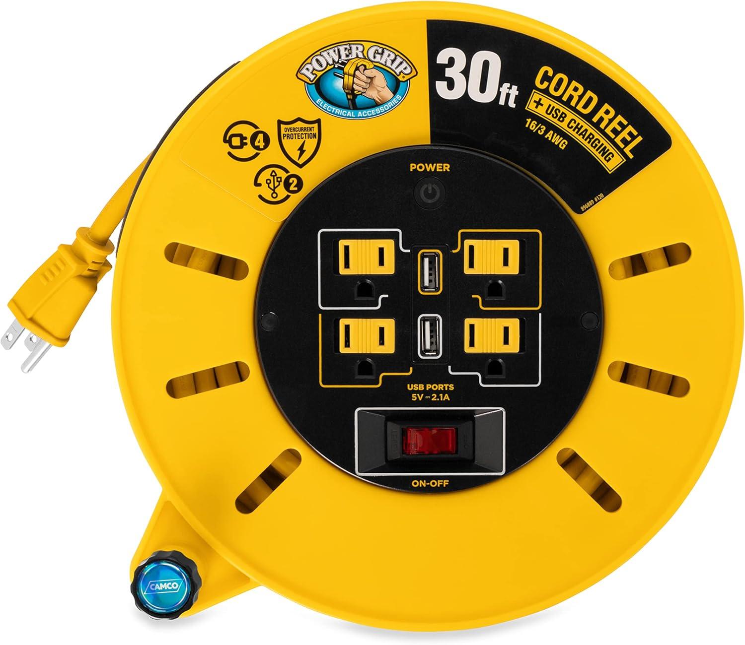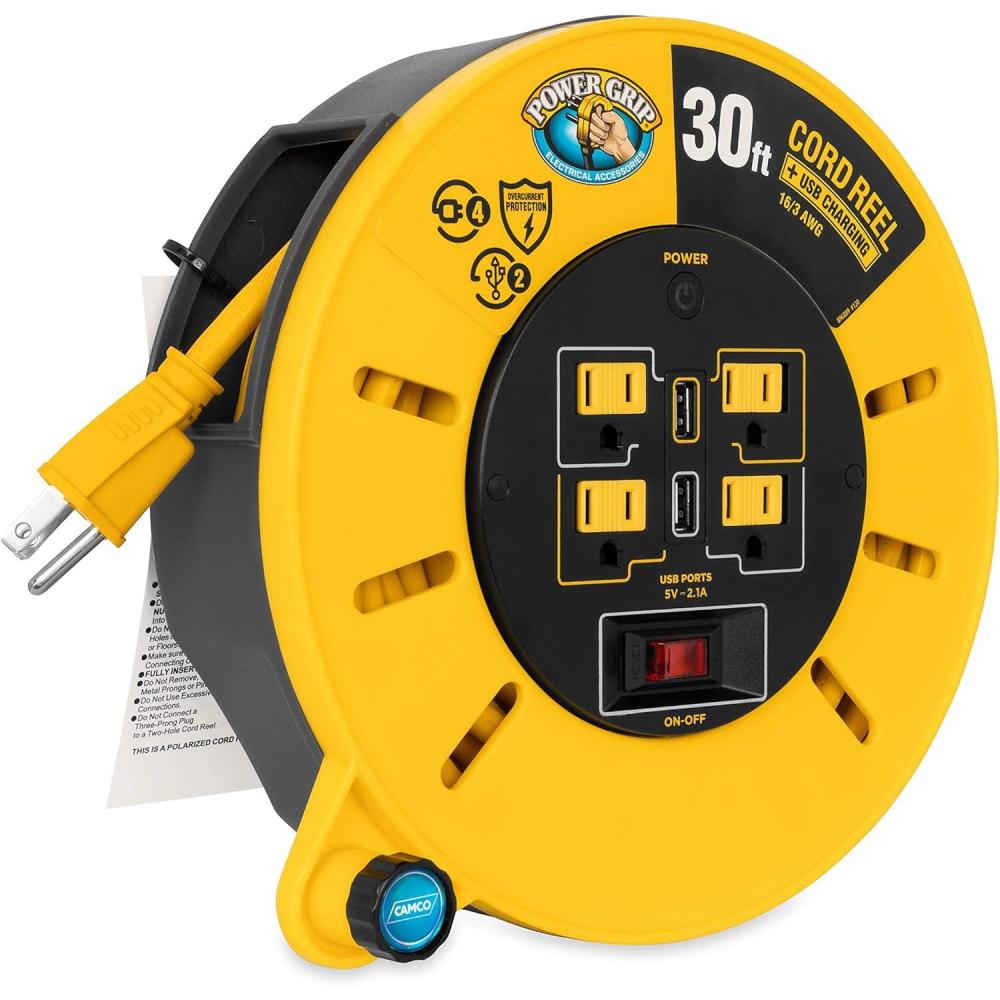 The Camco Power Grip 50-Foot Extension Cord Reel with USB Charging Ports is designed to provide you with the necessary length to power your equipment and devices while staying organized, untangled and ready to go. The 13-amp extension cord reel is rated for 125 volts/1625 watts. The cord is constructed with 14/3-gauge wire for superior conductivity. The cord reel features (4) 125V electrical outlets and (2) USB ports (2.1A shared across both ports) to power and charge multiple devices. It includes a convenient carrying handle for easy transport, an on/off switch and a built-in circuit breaker to protect against current overloads. This cord reel is designed for dry indoor use only. Product is UL listed in Canada and the USA, and is made to meet OSHA specifications. Includes a 3-year warranty.