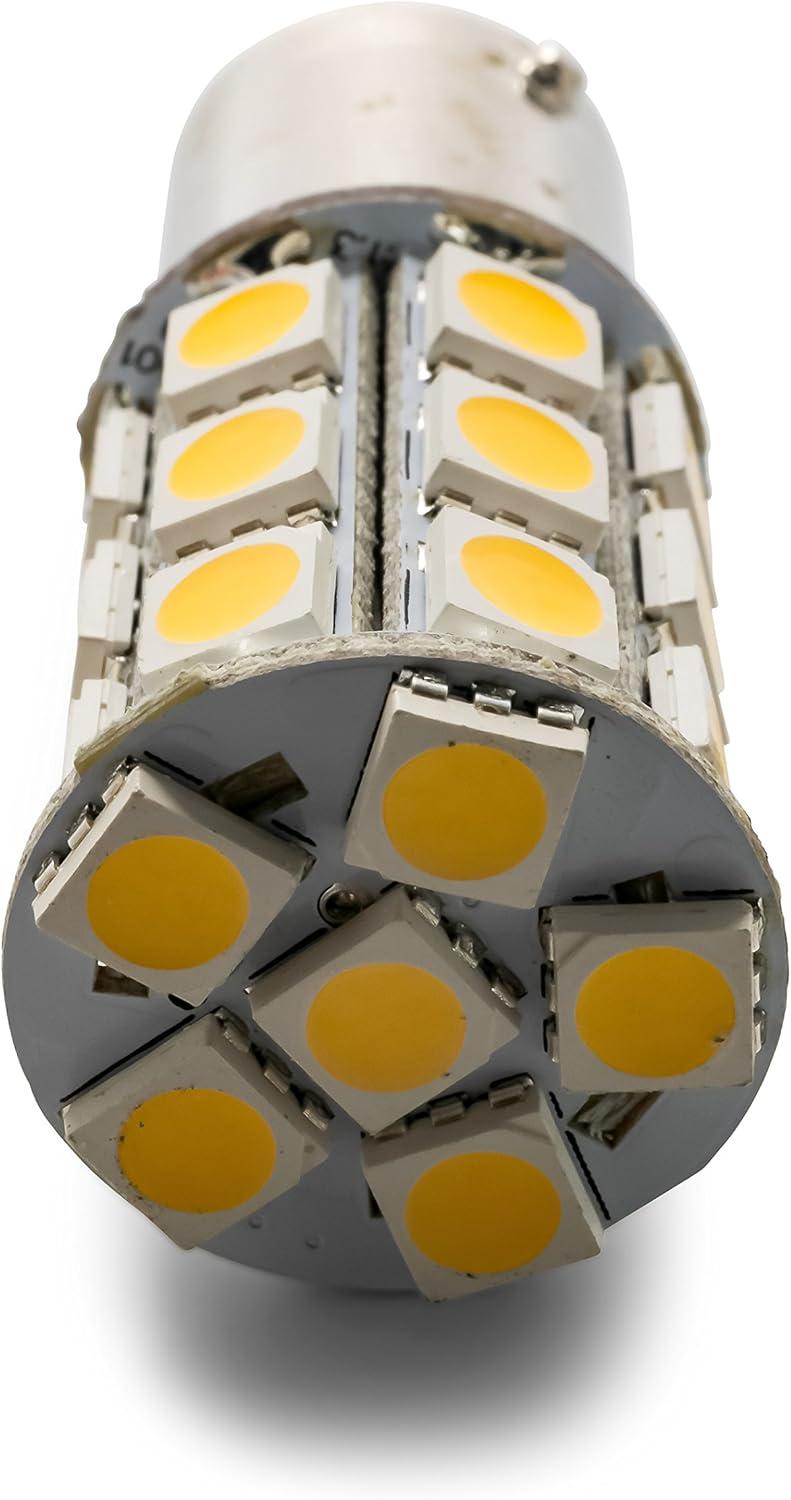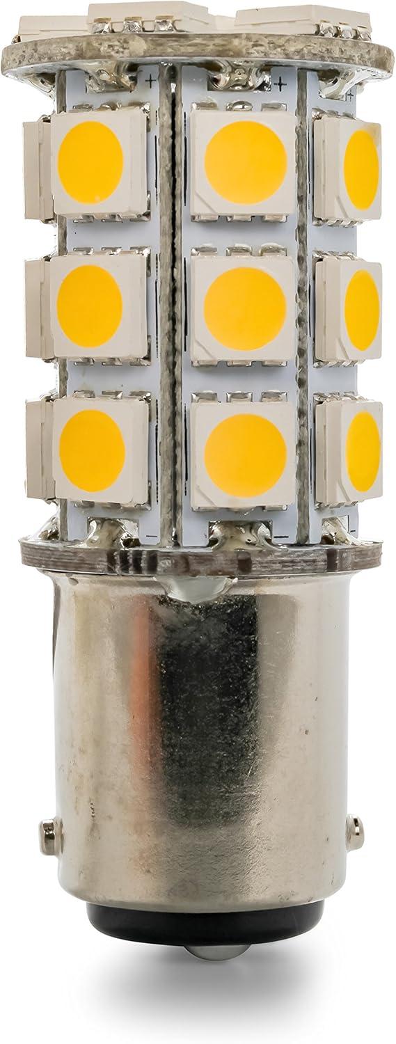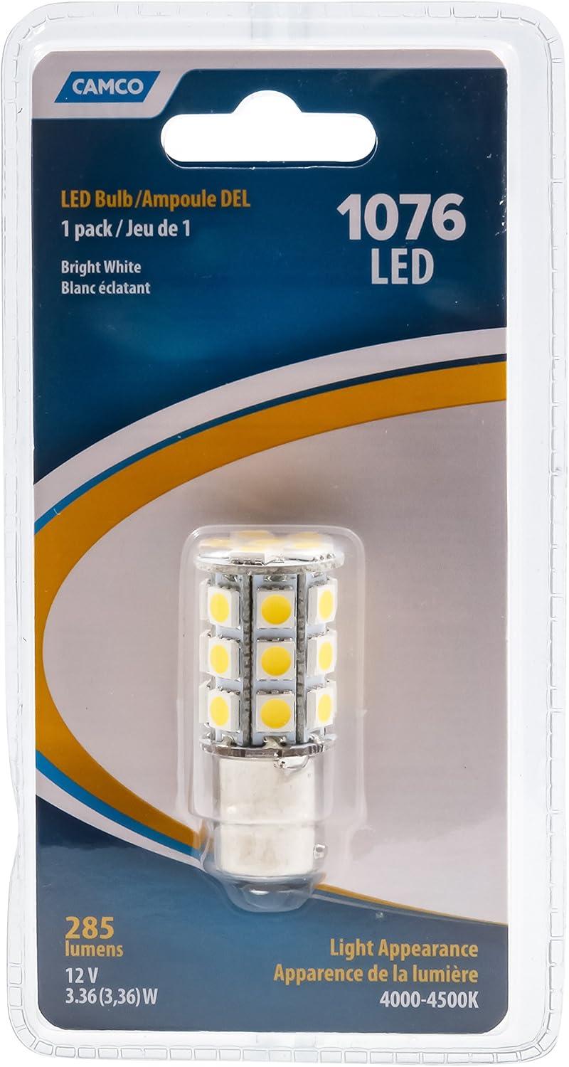Camco 54631 LED Replacement Bulb replaces 1076 (BA15D) style lights bulbs. It has 27 individual lights for a measured 285 lumens. 12V, bright white light, contains 1 bulb.