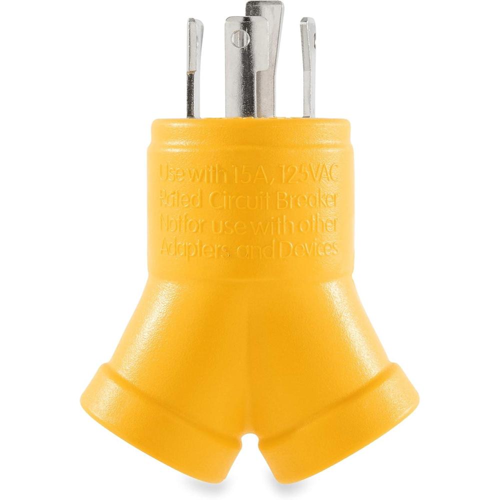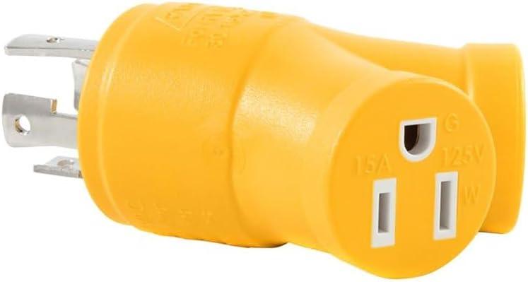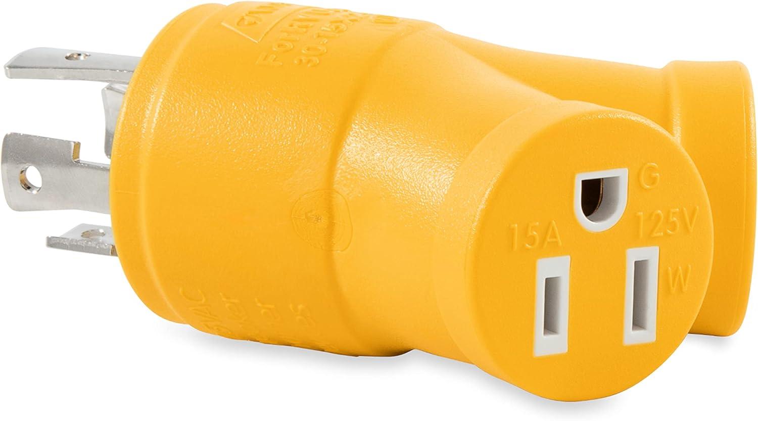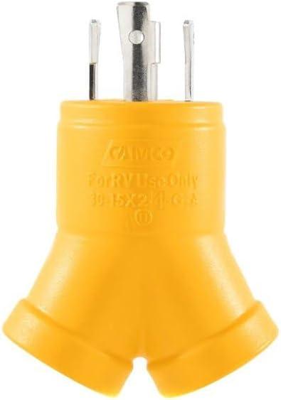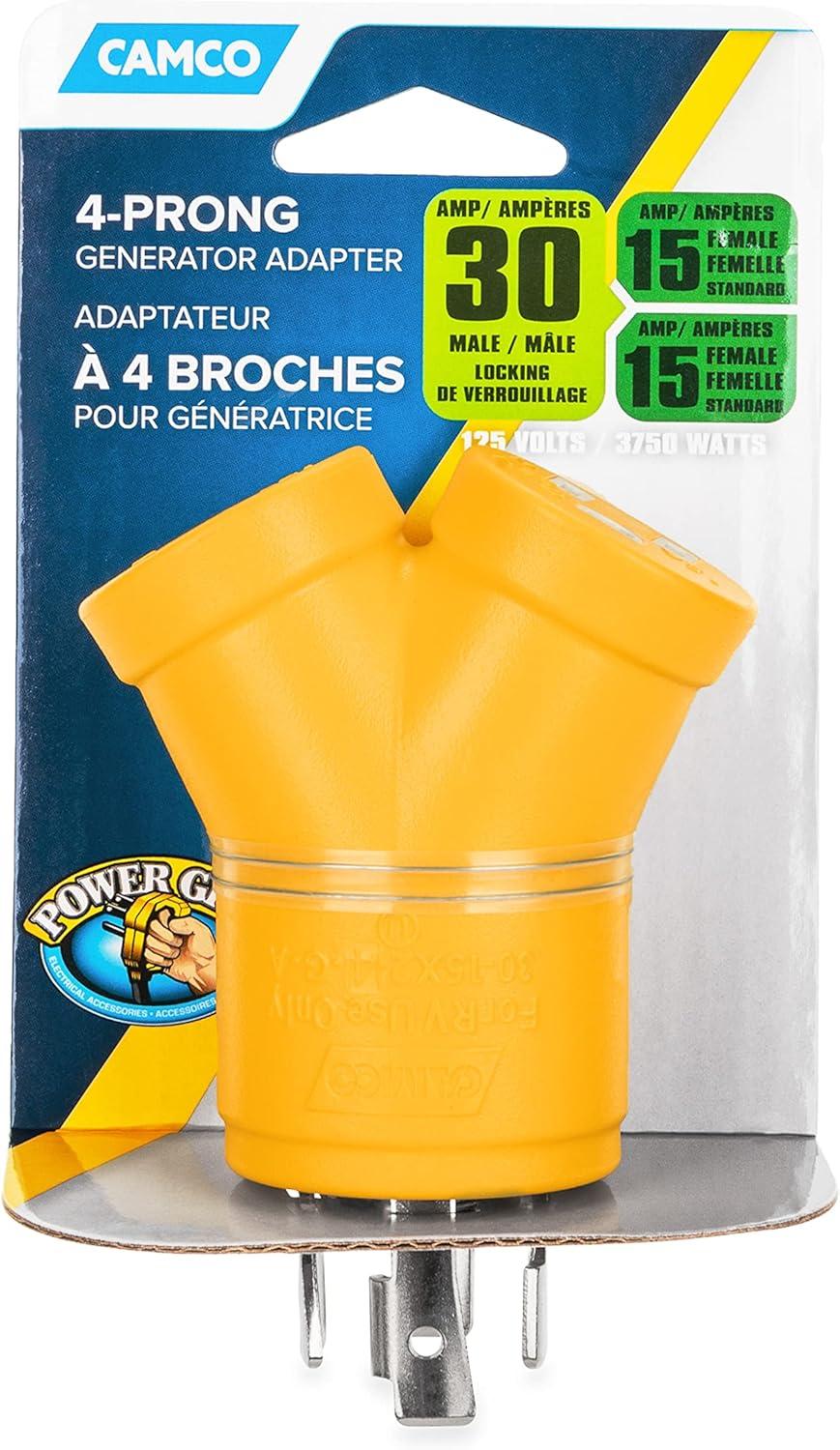 Camco's 4-Prong Generator Adapter allows you to easily and safely split one 30 AMP receptacle into two 15 AMP receptacles.