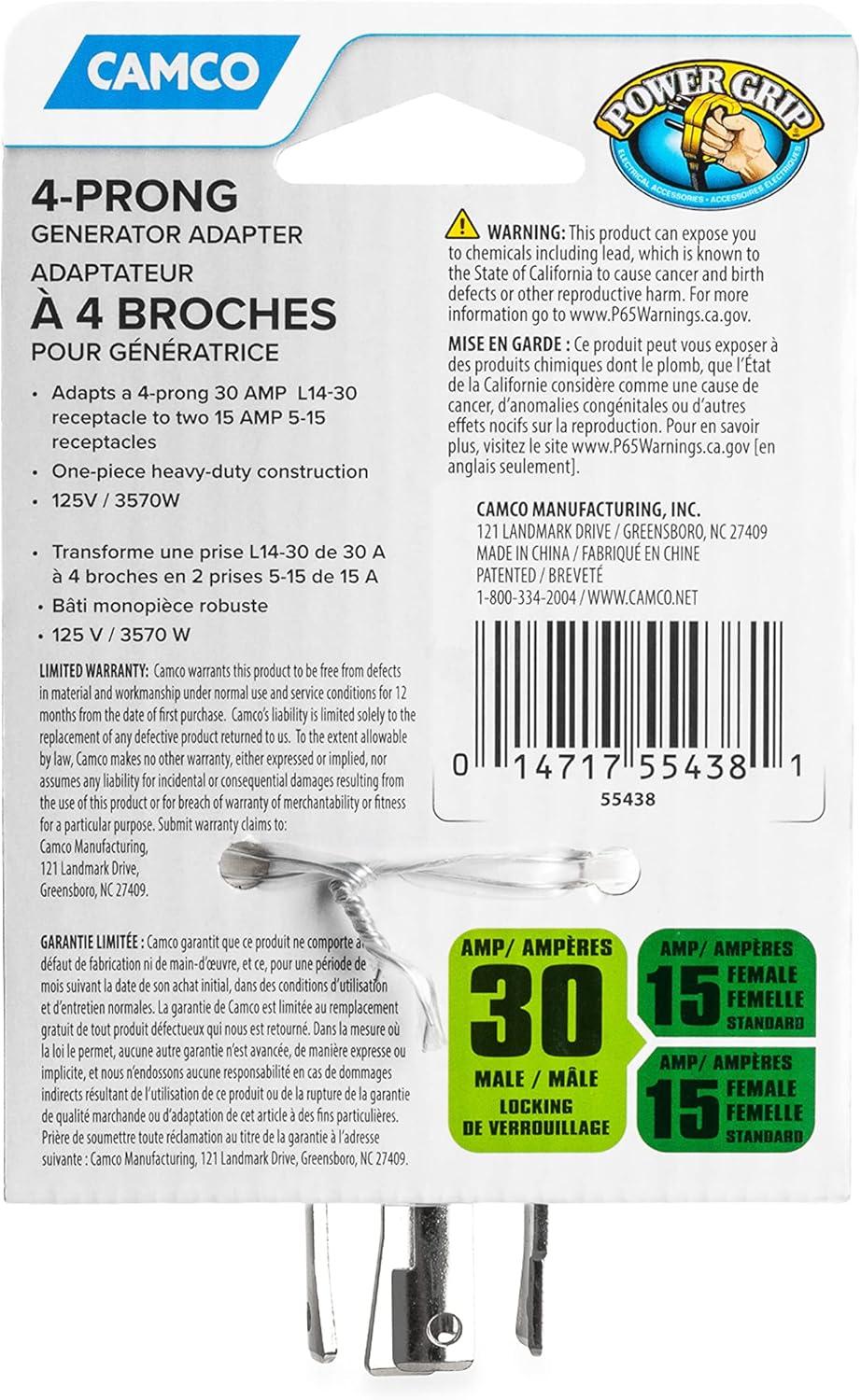 Camco 55438 PowerGrip (30M/2 x 15F) 4-Prong Generator Adapter(One Size)