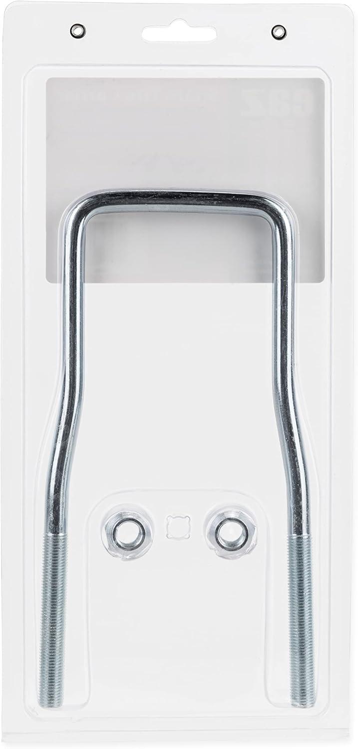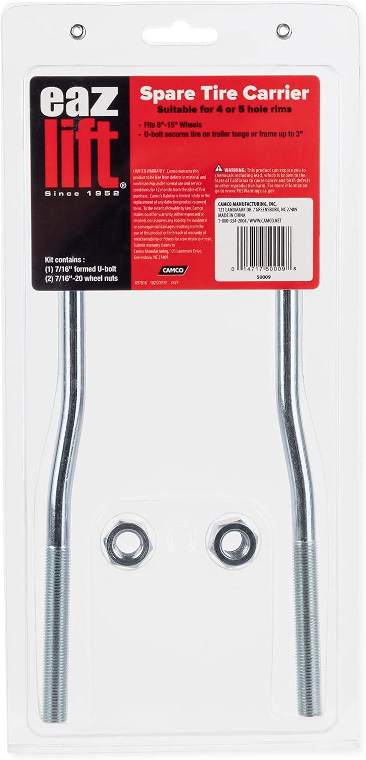 Camco's Eaz-Lift U-Bolt Spare Tire Carrier allows you to securely transport a spare tire on your trailer tongue. It is compatible with up to 3-inch trailer tongues and can hold wheels between 8 to 15-inches. This carrier measures 8 ¾-inches (L) x 4 3/16-inches (W) and is constructed of durable, zinc-plated steel. Product includes (1) spare tire carrier and (2) lug nuts. The carrier brackets are threaded for simple installation and the two lug nuts secure the tire to the frame.