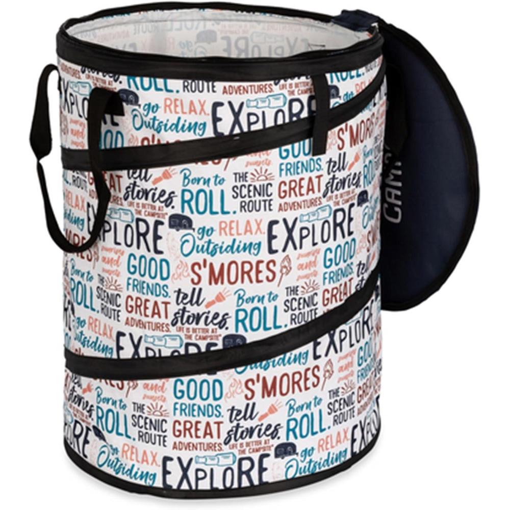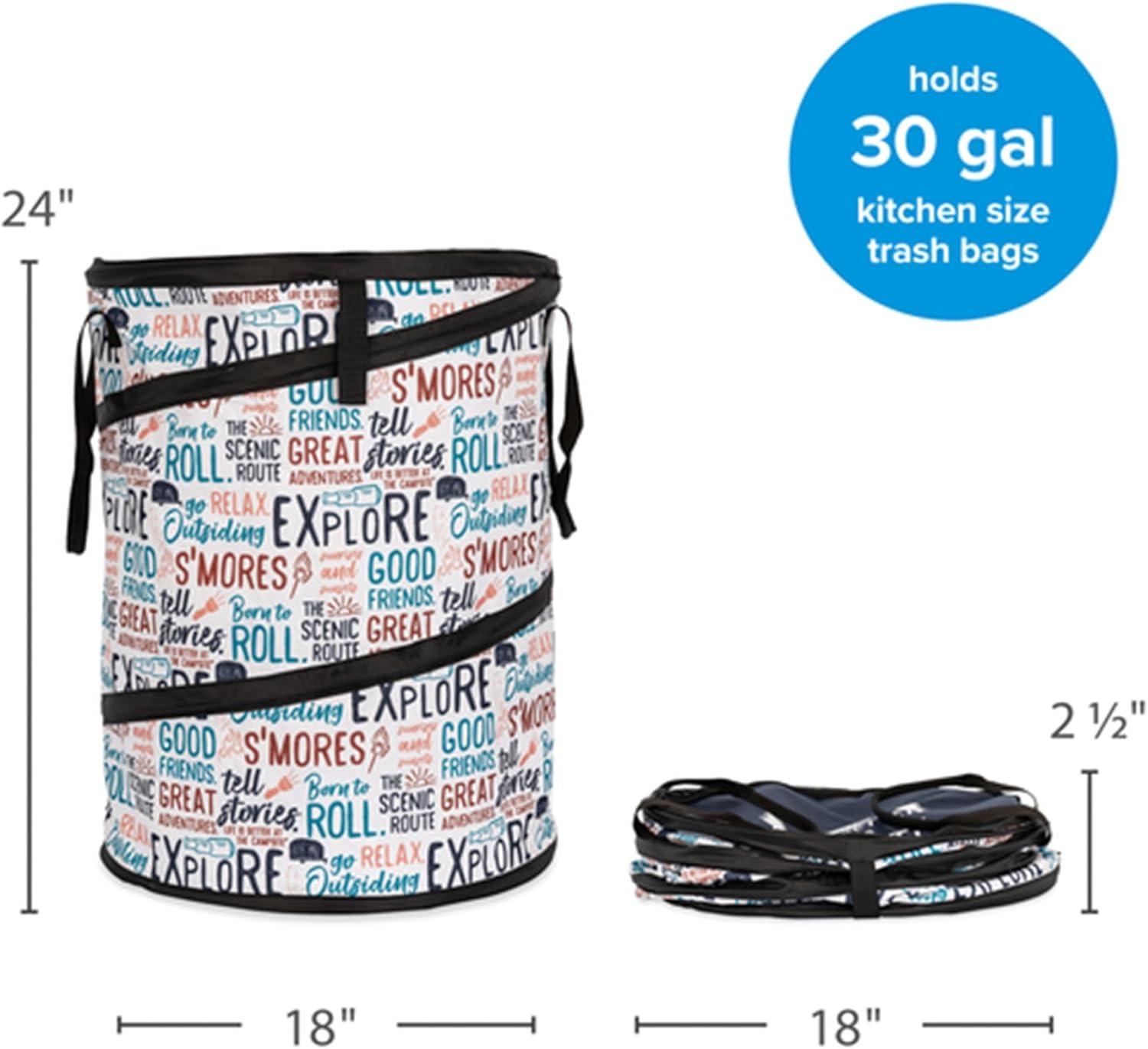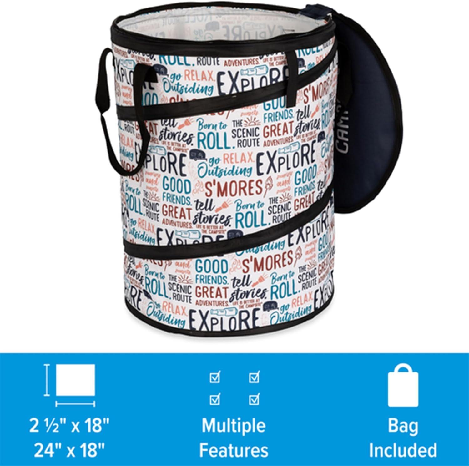 Elevate your outdoor adventures with the Camco Life is Better at the Campsite Pop-Up Container! This unique container expands from a compact 2 ½” tall to an impressive 24″ for abundant storage space. It easily fits 30-gallon trash bags with its spacious 18″ diameter. Made of fabric with a PVC inner liner for added durability, this tear-resistant container includes a zippered lid and padded handles. It even comes with a ground anchor for stability and a reusable storage bag. With its charming camping-themed design, this container adds a touch of fun and style to your outdoor experience. Whether you're RVing, camping, picnicking, boating, or tailgating, this collapsible bin is an ideal storage solution, allowing you to enjoy the outdoors in-style, without the clutter.