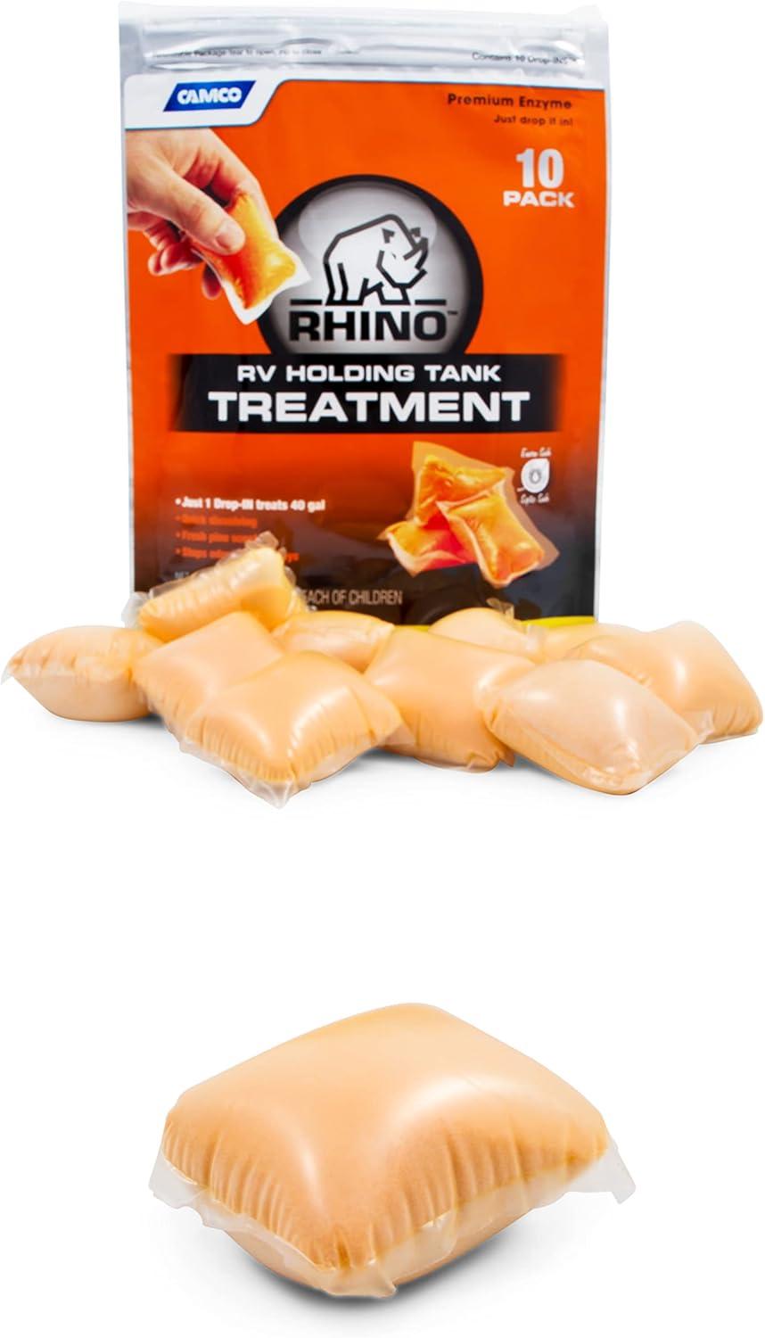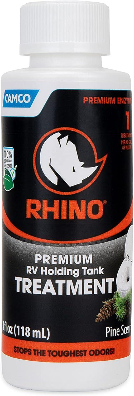 Camco's RhinoFLEX Premium Enzyme RV Holding Tank Treatment Singles contain an enzyme complex that digests waste, tissue, fats and proteins. This treatment activates when diluted. Just (1) bottle treats up to 40-gallons and stops odors for up to 7 days. All components are biodegradable, septic safe and do not contain harmful formaldehyde, pesticides or biocides. Includes (8) 4 oz. bottles. Fragrance: pine scent. Made proudly in the USA. Camco makes quality products for RVing, boating, camping, towing, tailgating, and grilling that help you take your passion for the outdoors to the next level.